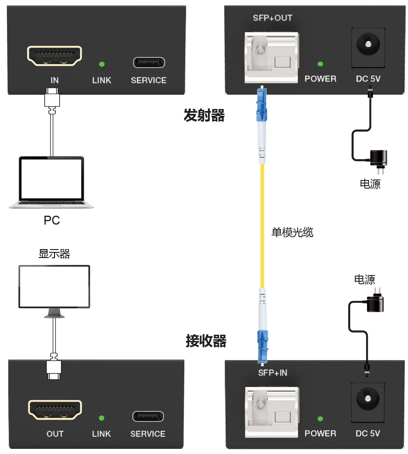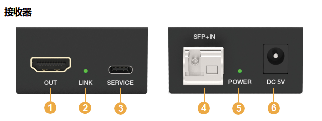 接收器 | 輸入:1x SFP+ IN [LC母口];1x SERVICE [USB-C,升級端口]; 輸出:1x OUT [HDMI Type A, 19-pin母口]; |