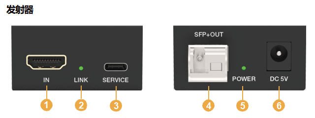 發射器 | 輸入:1x IN [HDMI Type A, 19-pin母口] ;1x SERVICE [USB-C,升級端口]; 輸出:1x SFP+ OUT [LC母口]; |